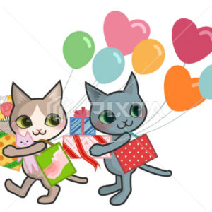 たくさんのプレゼントと風船を持った猫イラストです。リンク先より入手…