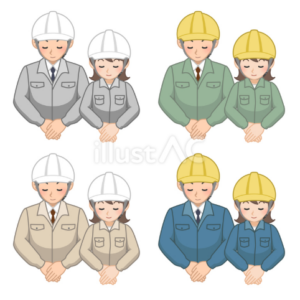 お辞儀している男性作業員と女性作業員のイラストです。イラストACか…