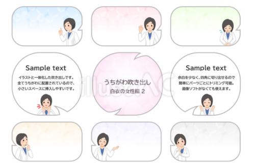 イラスト入り吹き出しのセットです。白衣の女性2つめです。1つめはこちらです。イラストACからダウンロードできます。透過PNG、JPG、AIファイル無料です。