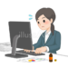 パソコンで大量の仕事をしている作業着の男性のイラスト