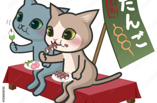 お茶を飲みながらパンケーキを食べる2匹の猫イラスト