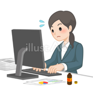 パソコンで大量の仕事をしている女性のイラストです。イラストACから…