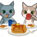 • お茶を飲みながらパンケーキを食べる2匹の猫イラスト
